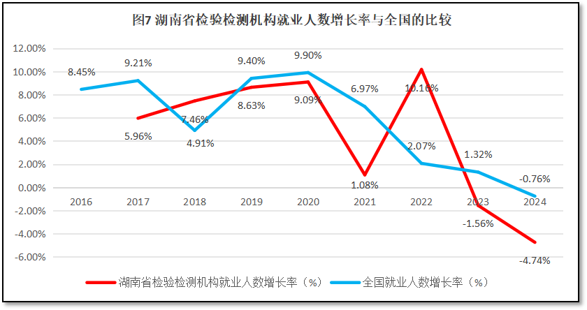 湖南省检验检测机构就业人数增长率与全国检验检测机构就业人数增长率的比较,如图7所示。