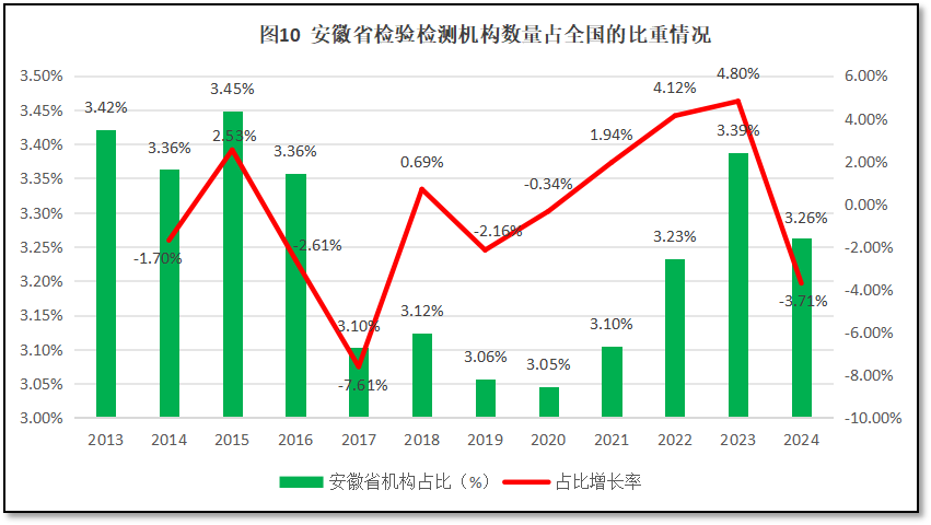 截至2024年末,安徽省检验检测机构数量为1731家,约占全国检验检测机构数量的3.26%,排名全国第13位,较2023年度排名下降了1位。过去12年,安徽省检验检测机构数量在全国检验检测行业中的占比以及占比的增长率如图10所示。