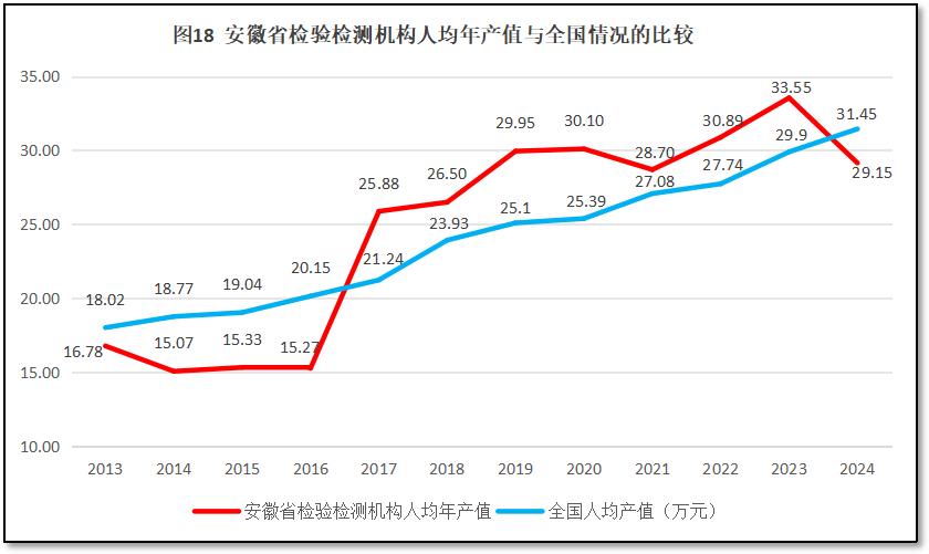 由图17可见,2016年之前,安徽省检验检测机构人均年产值增长率较低,在2017年出现一次69.4%的巨大增幅后,人均年产值从15万元左右快速增长到25万元左右,此后增速放缓,部分年份还出现负增长。2023年,安徽省检验检测机构人均年产值一度达到33.55万元的峰值,但2024年出现较大回落,仅有29.15万元,同比增幅为-13.11%,是历年下降程度最大的一次。