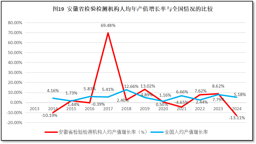 再来看安徽省检验检测机构人均年产值增长率与全国人均年产值增长率的比较,如图19所示。